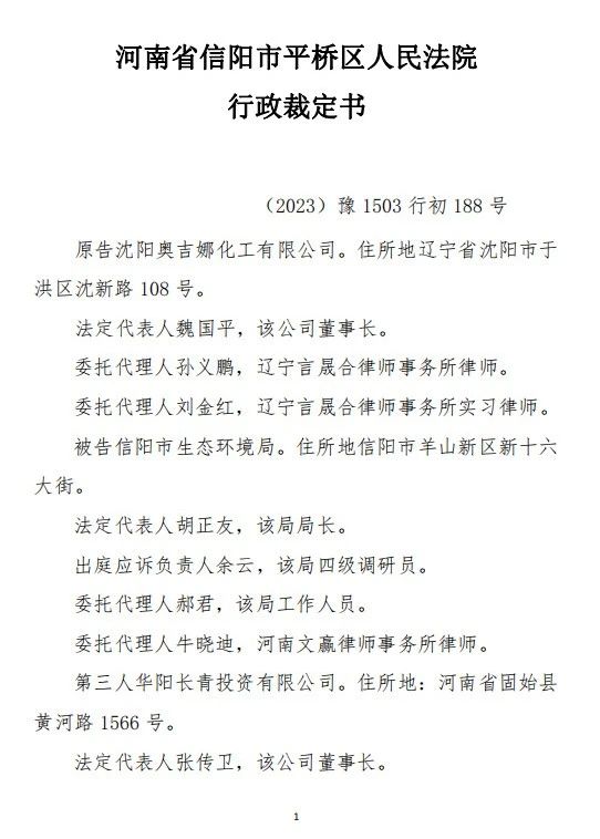 法院的裁定理由是:被告的《信陽市生態(tài)環(huán)境局關于沈陽奧吉娜化工有限公司舉報華陽長青投資有限公司違法經營及固始分局不作為、亂作為的問題調查處理函》(下稱《調查處理函》)與原告訴請沒有利害關系,因此,原告沒有訴訟資格,下附一:《河南省信陽市平橋區(qū)人民法院行政裁定書》(18頁)。