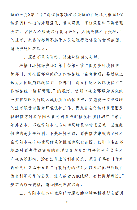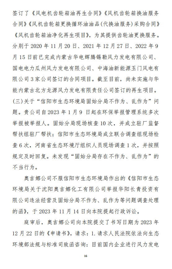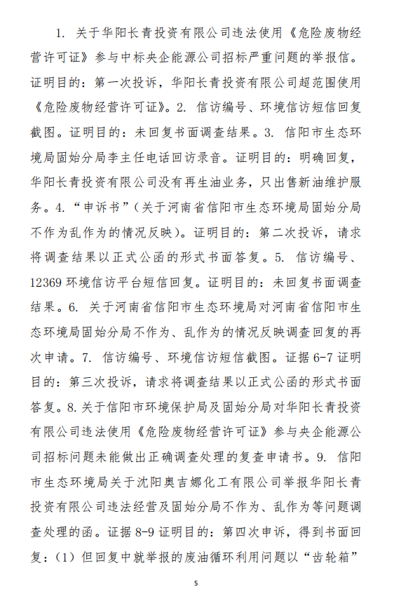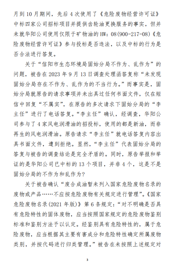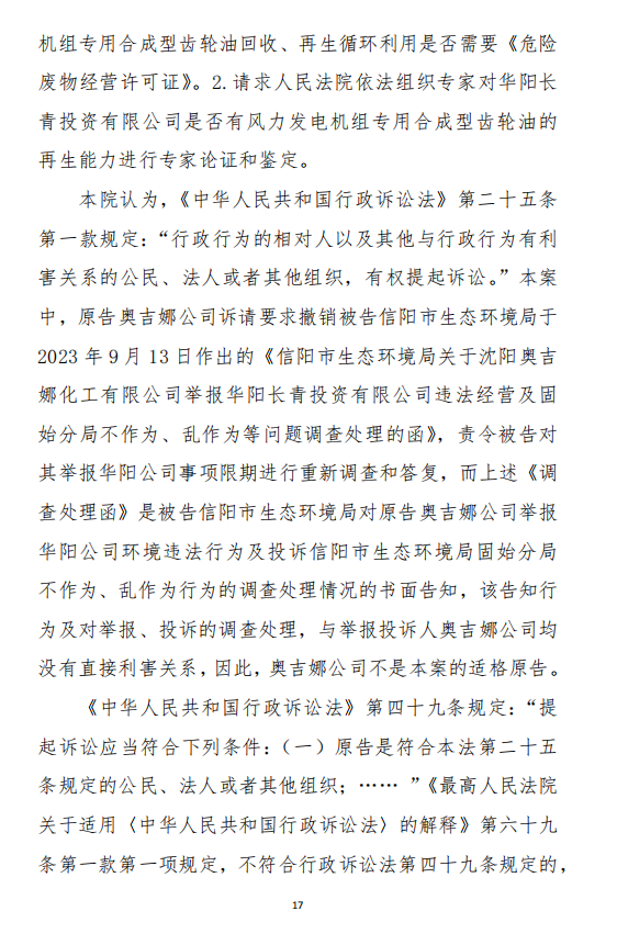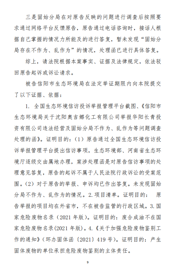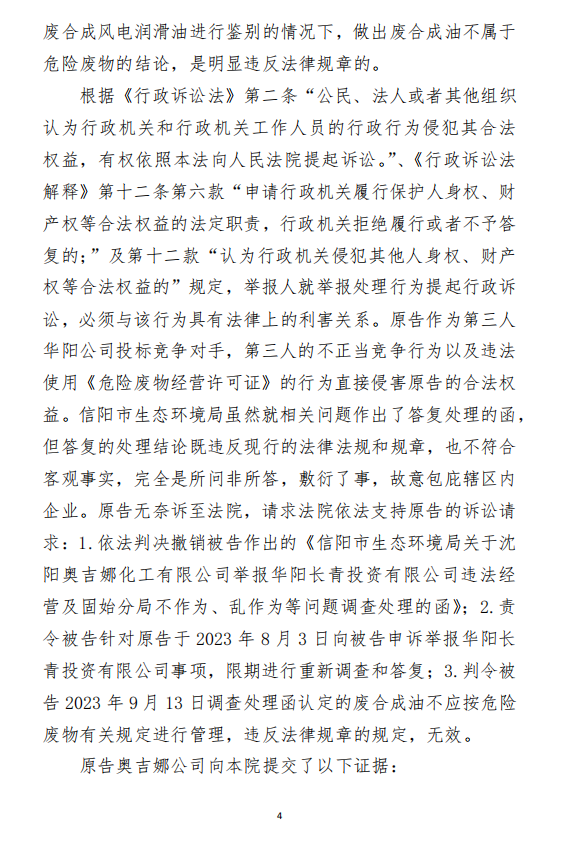 2、訴訟請求:請求人民法院判決撤銷被告作出的《信陽市生態(tài)環(huán)境局關于沈陽奧吉娜化工有限公司舉報華陽長青投資有限公司違法經營及固始分局不作為、亂作為等問題調查處理的函》;責令被告對原告向被告舉報華陽長青投資有限公司事項,限期進行重新調查和答復;判令被告認定的廢合成油不應按危險廢物有關規(guī)定進行管理違反法律規(guī)章規(guī)定,無效。