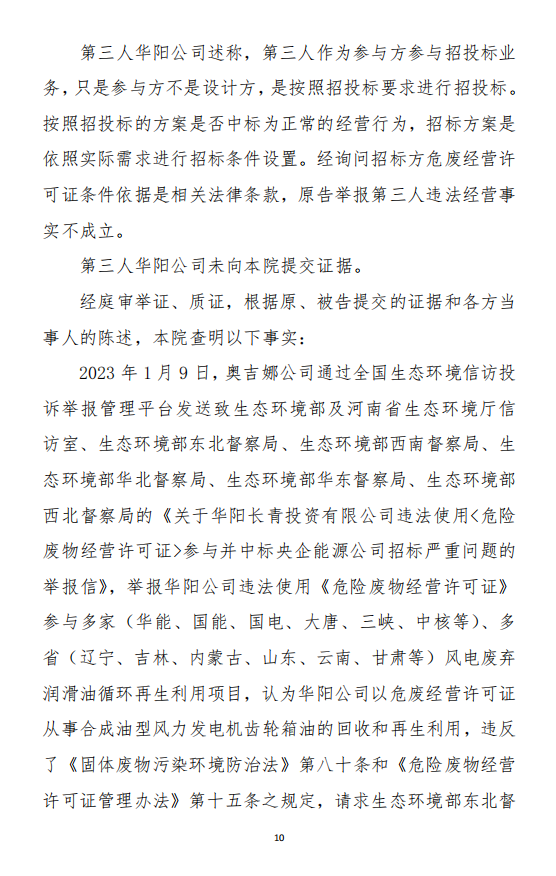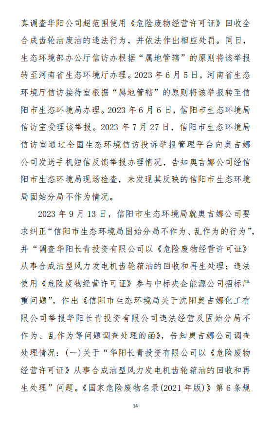 2023年9月13日,信陽環(huán)境局向奧吉娜公司致《信陽市生態(tài)環(huán)境局關于沈陽奧吉娜化工有限公司舉報華陽長青投資有限公司違法經營及固始分局不作為、亂作為等問題調查處理的函》。函中:一是,以“齒輪箱”替換“齒輪箱油”,偷換概念;二是,做出了廢風電合成(齒輪)油不屬于危險廢物的結論;三是,未發(fā)現(xiàn)固始分局存在不作為、亂作為的不當行為。再次否定奧吉娜公司的舉報和投訴。