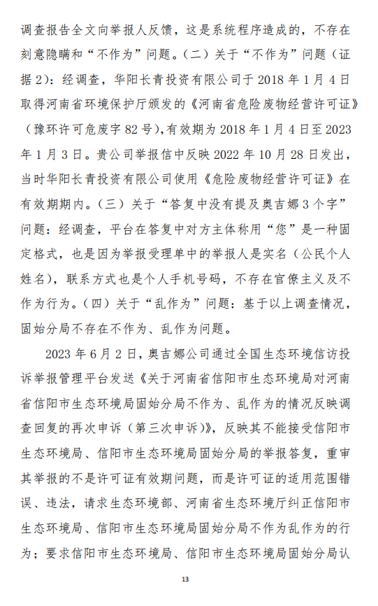 2023年6月13日,奧吉娜公司再次向環(huán)境部提出申訴,指出,奧吉娜舉報的不是許可證有效期問題,而是許可證的適用范圍錯誤、違法。2023年7月27日,奧吉娜公司收到回復稱,經信陽市生態(tài)環(huán)境局現(xiàn)場檢查,未發(fā)現(xiàn)固始分局不作為情況。