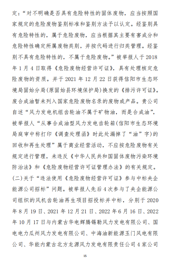 奧吉娜公司在參與各央企風電潤滑油招投標采購中發(fā)現(xiàn),注冊于河南省信陽市固始縣的華陽長青投資有限公司(以下稱:華陽長青公司),憑借其持有的《危險廢物經營許可證》,屢次以“風電齒輪油再生利用”的名義中標。然而,奧吉娜公司發(fā)現(xiàn),華陽長青公司的《危險廢物經營許可證》適用范圍并不包含合成型廢風電齒輪油,屬于違規(guī)使用,涉嫌違反《環(huán)境保護法》。于是,2022年10月18日,奧吉娜公司依法向國家生態(tài)環(huán)境部(以下稱:環(huán)境部)進行舉報。按程序,舉報調查由信陽市生態(tài)環(huán)境局固始分局(以下稱:固始分局)辦理。