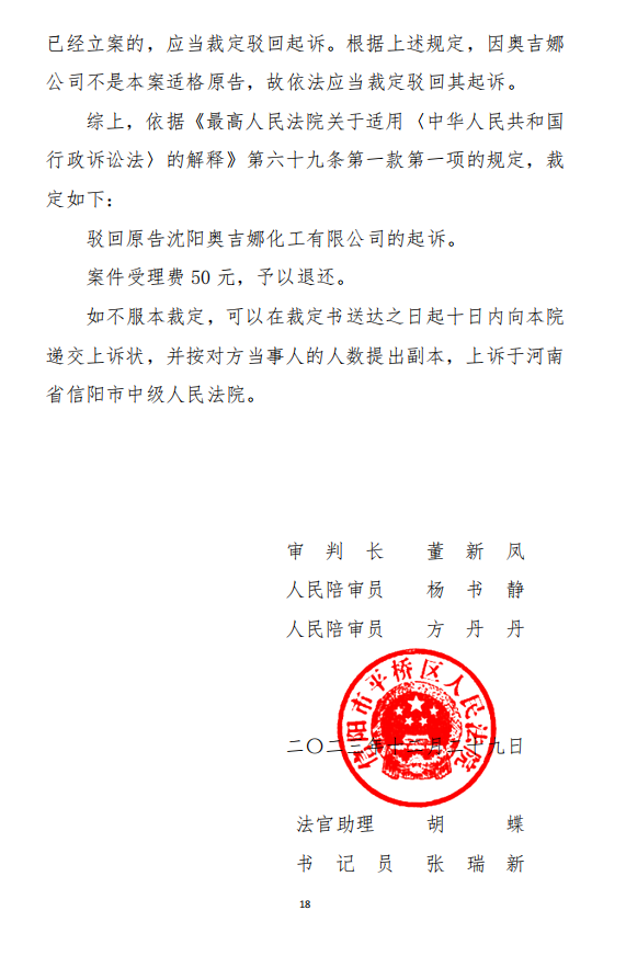 2023年12月29日,河南省信陽市平橋區(qū)人民法院裁定:駁回原告沈陽奧吉娜化工有限公司的起訴。